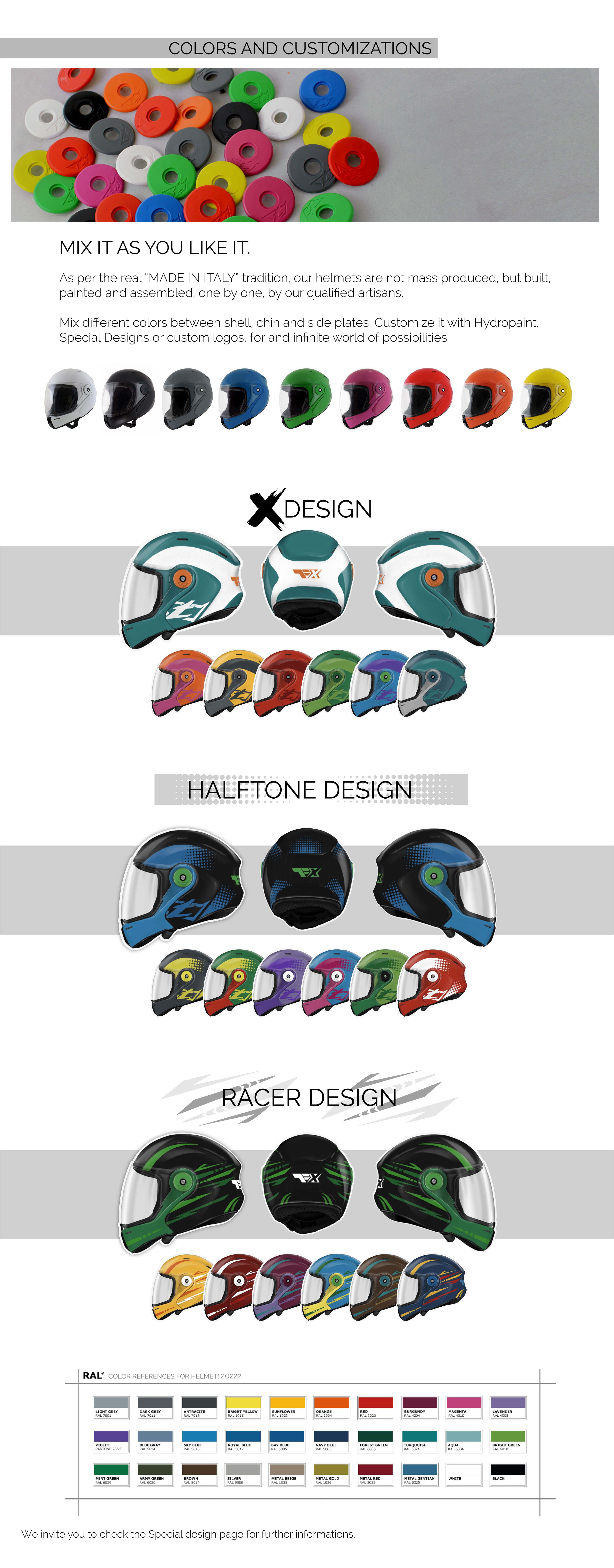 Step by step you can fully customize your suit or helmet by choosing features such as fabrics, colors, logos, options, setups and our additional graphics.
